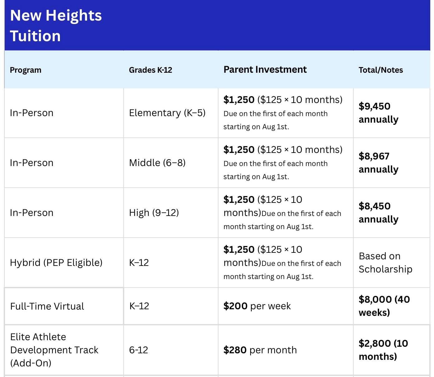 At New Heights Preparatory Academy, we are proud to serve families in Ocoee, Apopka, and Winter Garden with a structured, high-quality private K–12 education. We believe transparency matters, and we want parents to clearly understand the investment in their child’s academic and personal growth. Below you will find detailed tuition information, payment options, and scholarship opportunities available for qualifying families across West Orange County.